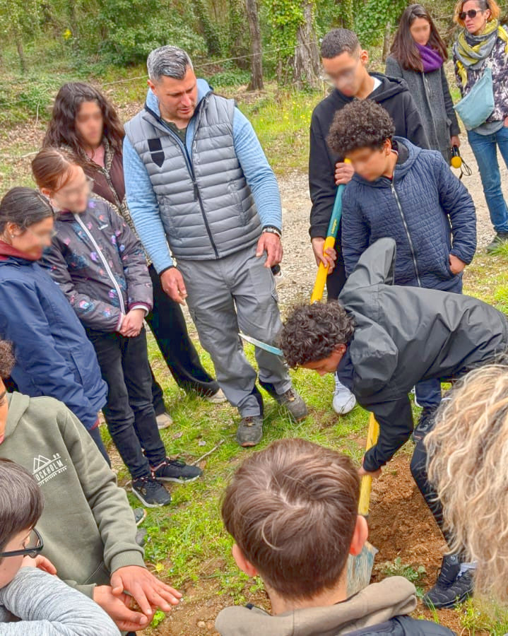 Chaque élève à participé au chantier. Des espèces présentes sur la parc ont été déplacées sur une zone où seules des graminées poussaient. Plantes herbacées, arbustes et surtout un jeune Micocoulier de Provence âgé de 1 ans qui traversera les générations, puisque sa longévité avoisine les 600 ans.