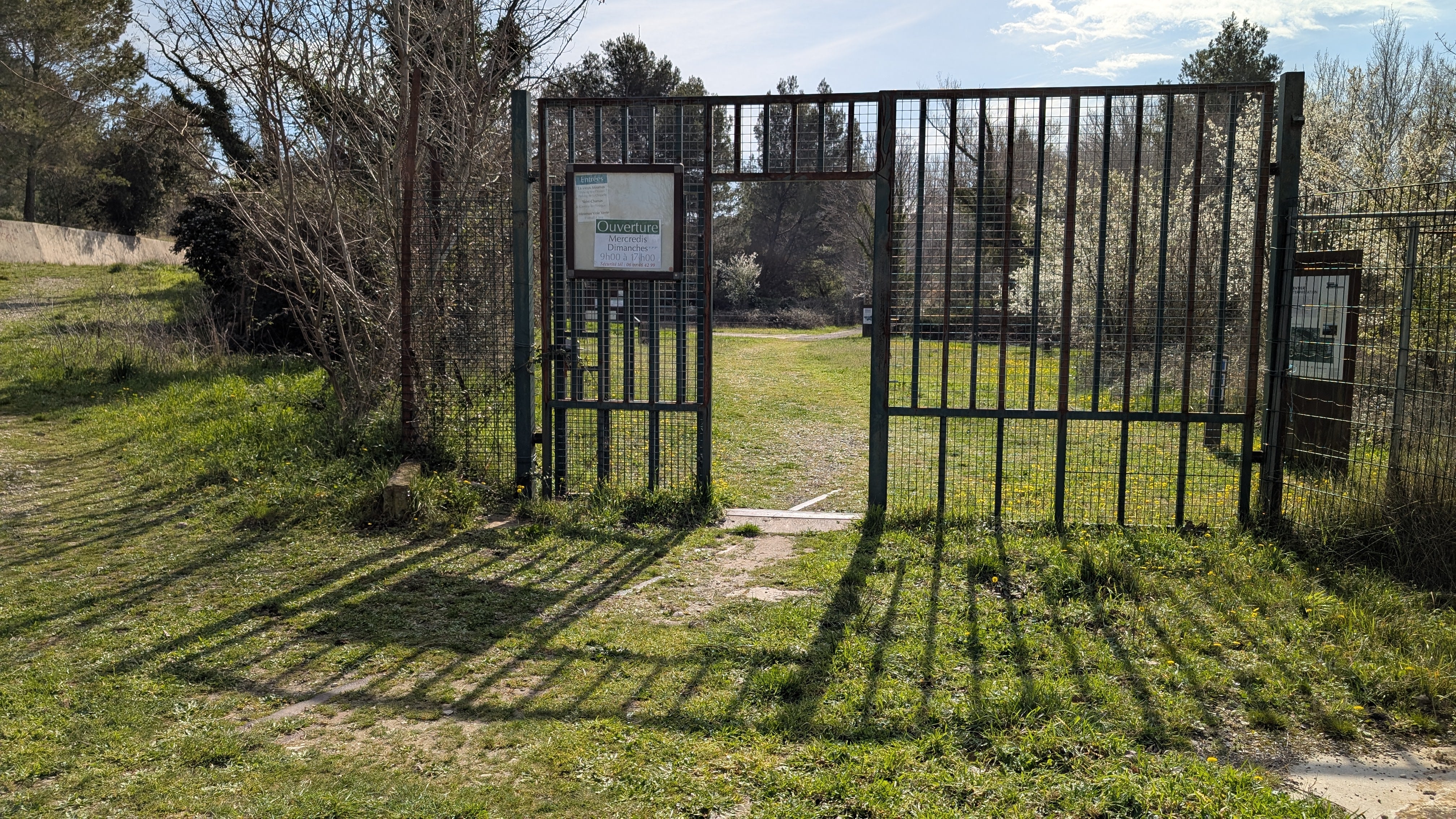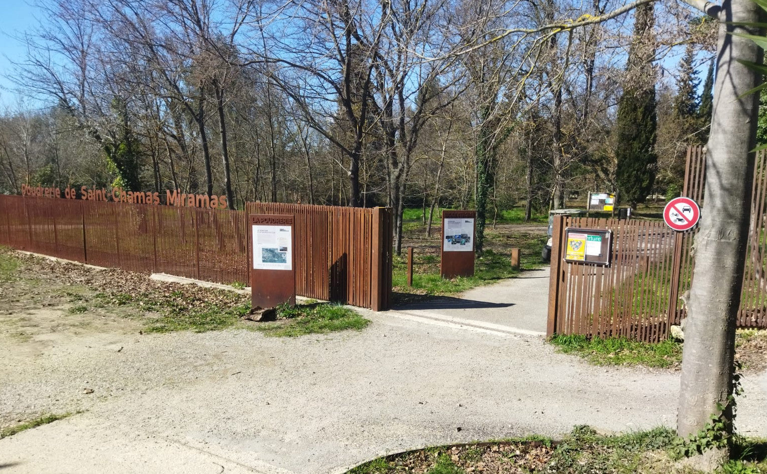 Entrée du site situé au croisement des chemins du GR 2013, Chemin du Rile et du chemin des sources. Il n'est accessible seulement en déplacement doux.
